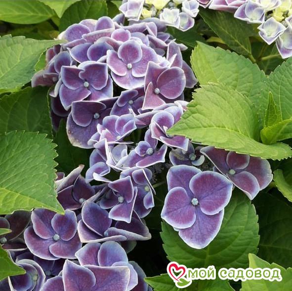 Гортензия крупнолистная Тиволи — один из самых любимых сортов. Цветет крупными соцветиями сине-фиолетового цвета с белой каймой по краю. Цветение растянуто до октября. Окрас соцветий фиолетово-синий, при слабой кислотности почвы окрас розовый, малиновый, фиолетовый, сиреневый. Куст достигает в высоту до 0,9 метров, в ширину растение занимает 1-1,2 м.   УХОД Гортензии влаголюбивы. При отсутствии дождей раз в неделю их необходимо поливать из расчета 15-20 л на куст, при наличии дождей достаточно одного полива в месяц. Чтобы повысить прочность побегов, рекомендуется полив растений слабым раствором марганцовки. Два-три раза за сезон одновременно с прополками проводят рыхление приствольных кругов. В период бутонизации удаляют все слабые веточки с соцветиями. В первые два года после посадки рекомендуется мульчирование почвы сухой листвой и окучивание куста. Место для посадки Для посадки гортензии при выращивании в южных регионах предпочтительнее выбирать полутенистое место, в средней полосе и на севере России — хорошо освещенные или слегка притененные участки. Молодые растения рекомендуется защищать от полуденного солнца и ветра. Гортензии очень влаголюбивы, поэтому посадка вблизи деревьев, поглощающих много влаги, для них не подходит.